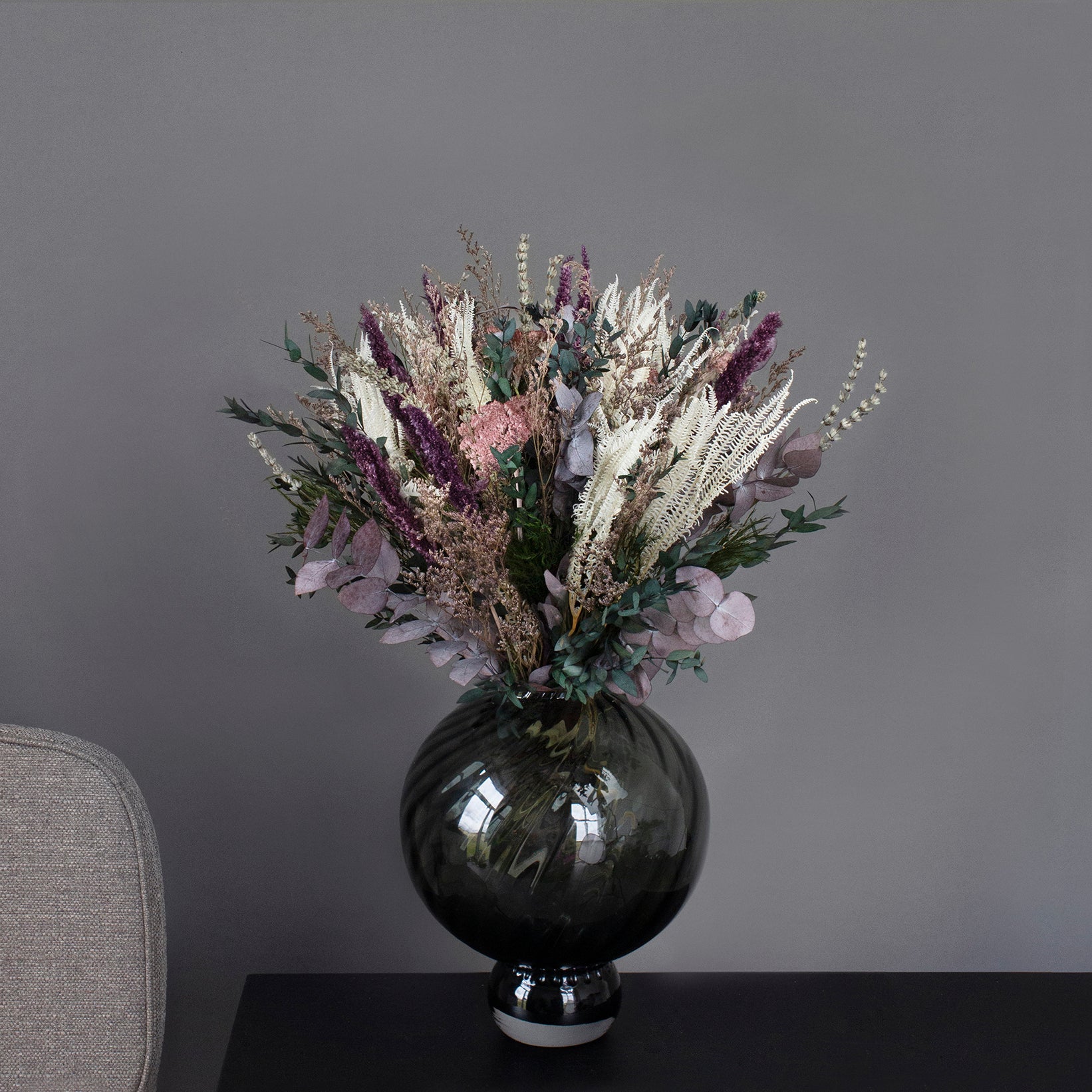 De nøje udvalgte blomster skaber balance og stil, og buketten holder sig smuk i mindst 6 måneder – helt uden vand og pasning.
