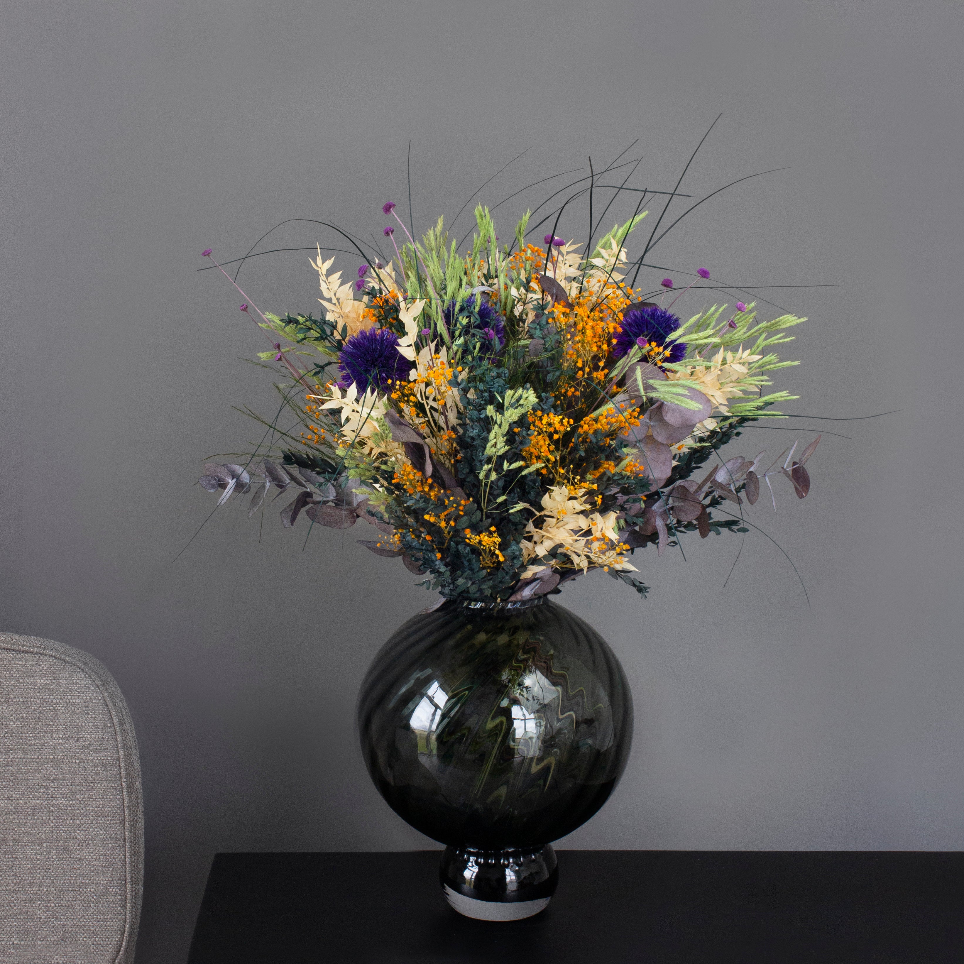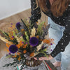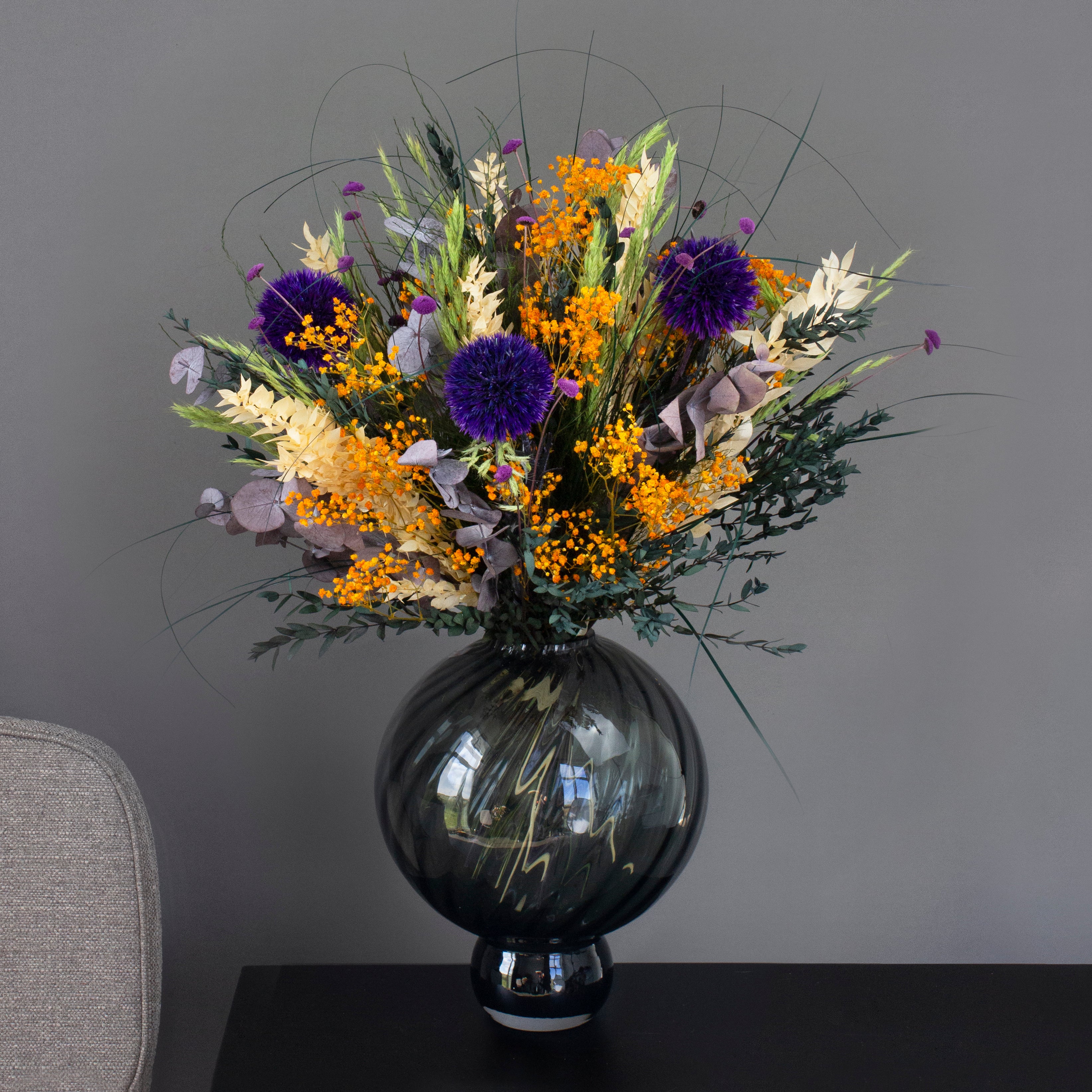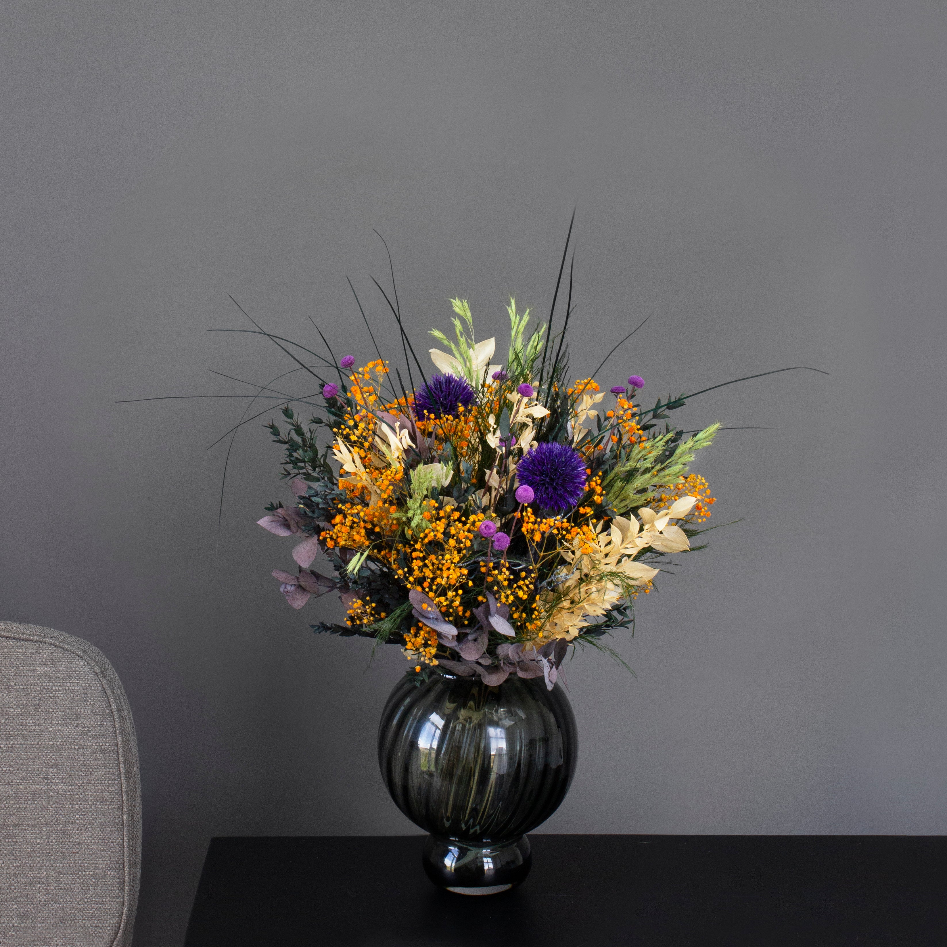 Bring naturens rå skønhed og varme ind i dit hjem med denne kraftfulde buket – en langtidsholdbar buket fyldt med energi, farver og personlighed. Orange brudeslør, lilla tidselkugler, eucalyptus og tørrede græsser samles i et vildt, organisk udtryk, hvor naturens vilde sider møder tidløs æstetik.