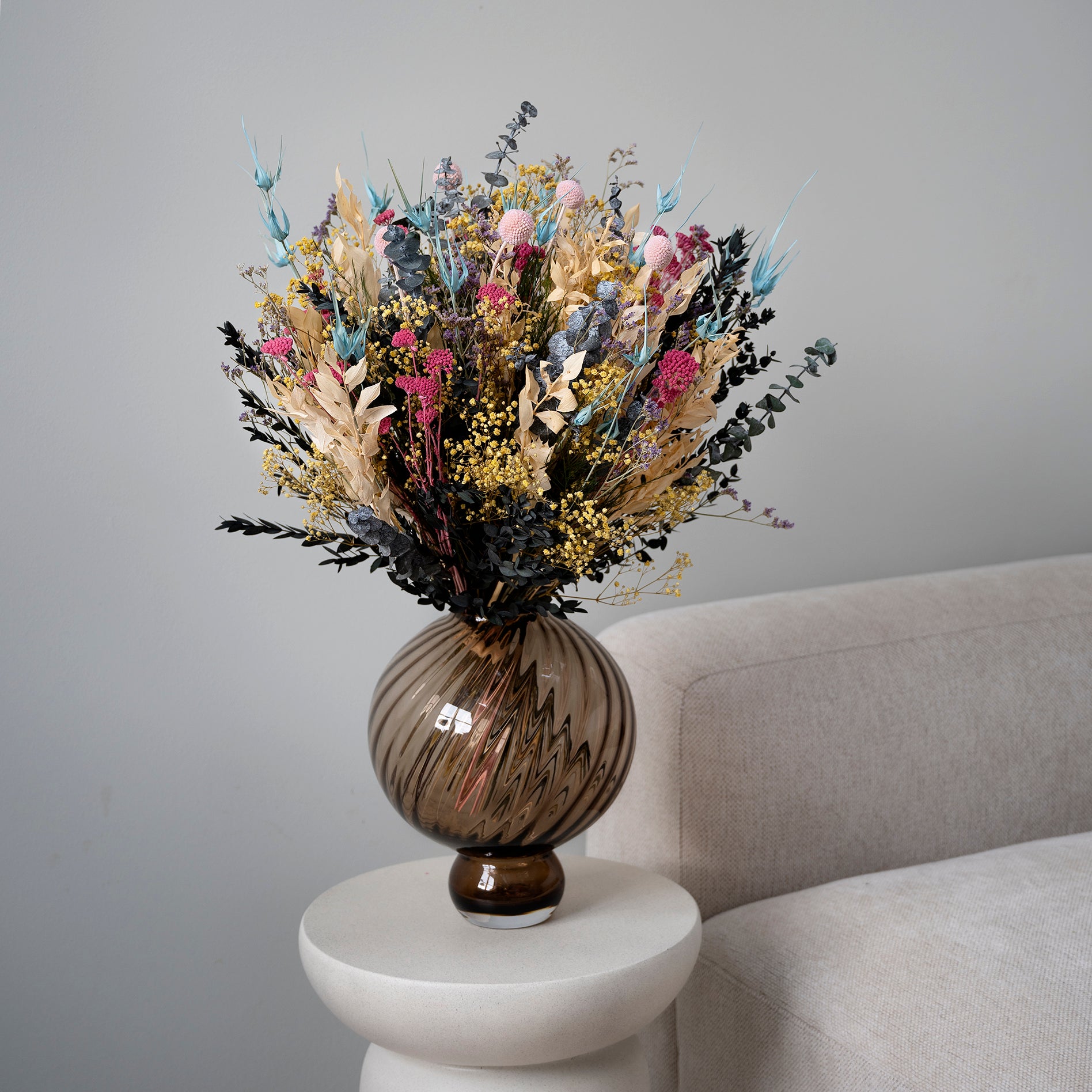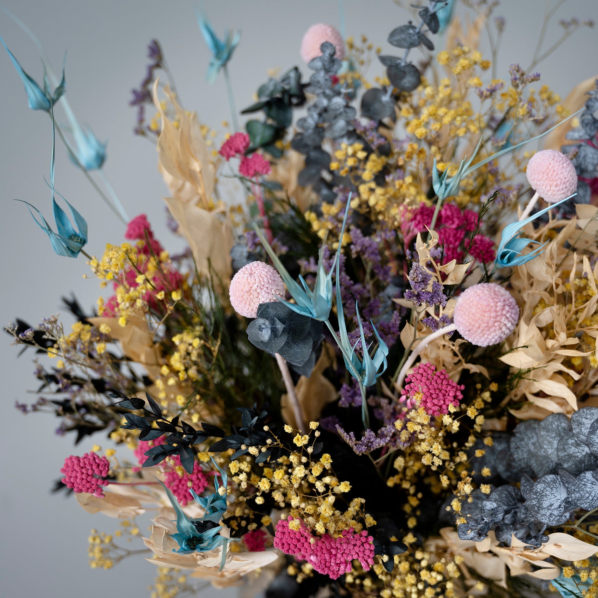 Vores buketter er hverken helt som traditionelle friske eller tørrede blomster – de befinder sig et sted midt imellem.