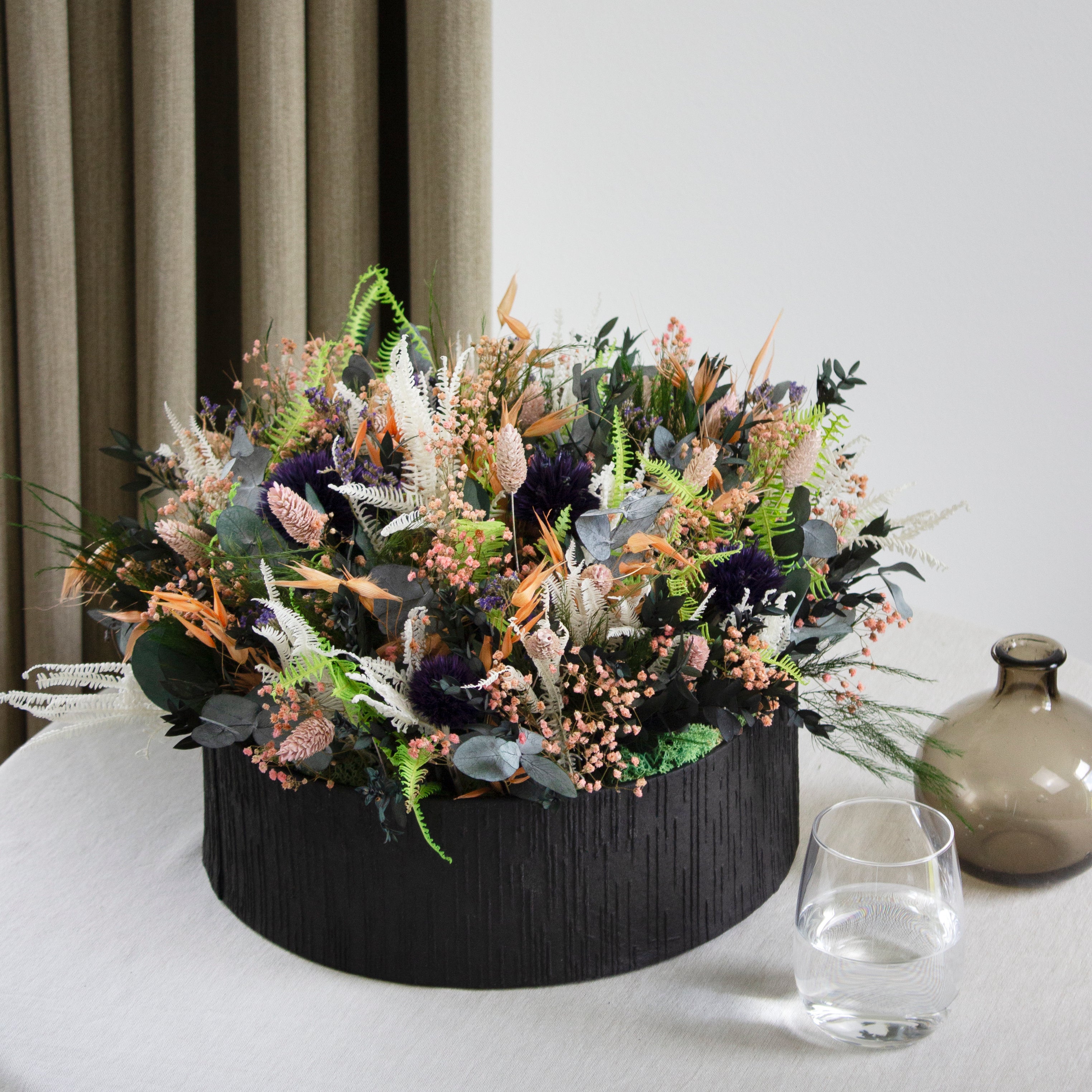 Dekoration Vild Elegance er en smuk, naturlig og langtidsholdbar blomsterdekoration, der bringer varme, personlighed og et strejf af vild elegance ind i din indretning. Med sine dybe lilla nuancer, brændt orange og lyse detaljer skaber den et harmonisk og iøjnefaldende udtryk – perfekt som dekoration til både hjem og kontor.