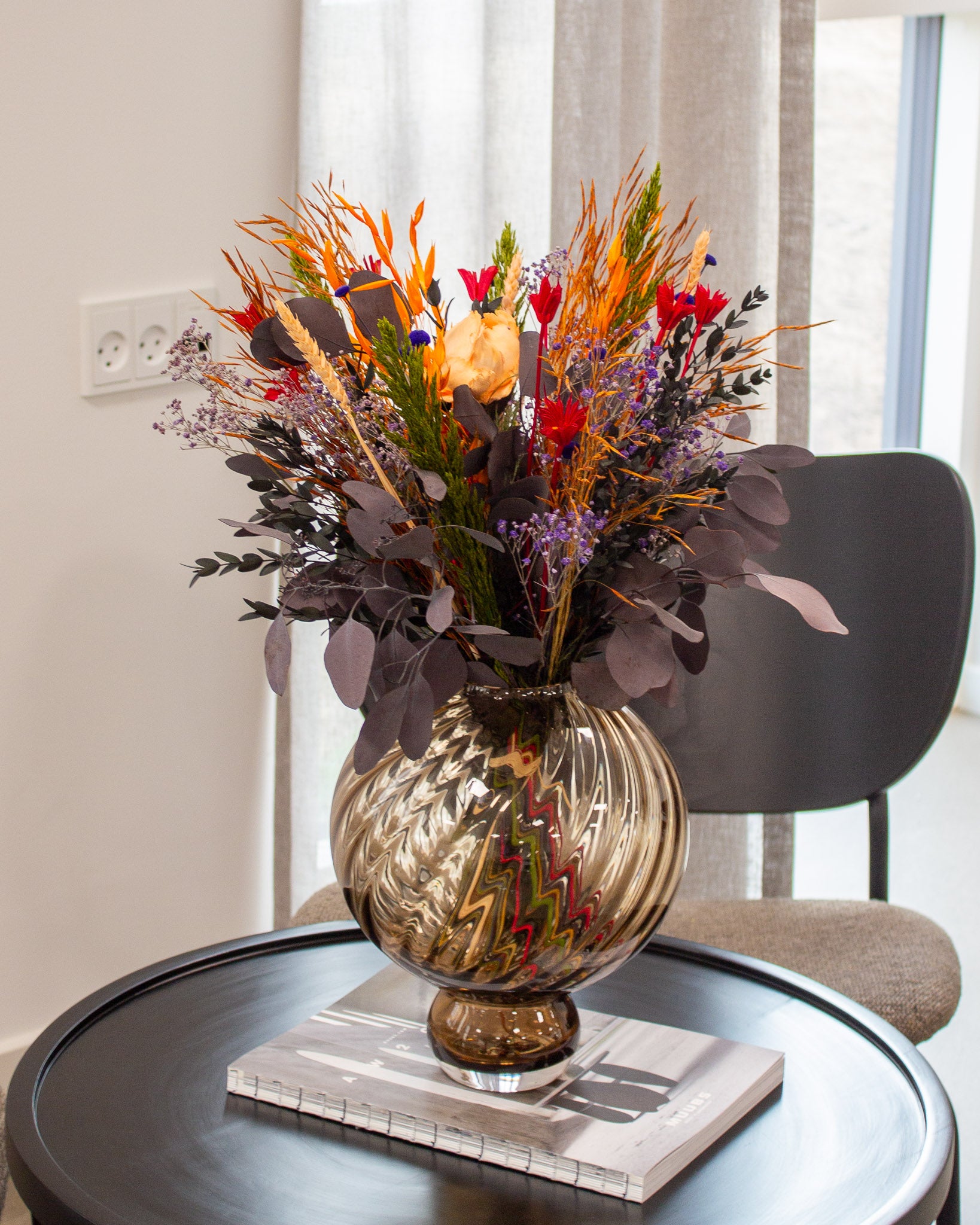 Buket Naturligvis - Har en højde på 50-55 cm og passer elegant til et lille spisebord, sofabord eller en kommode. Vi anbefaler brede og runde vaser med en højde på 15-25 cm.