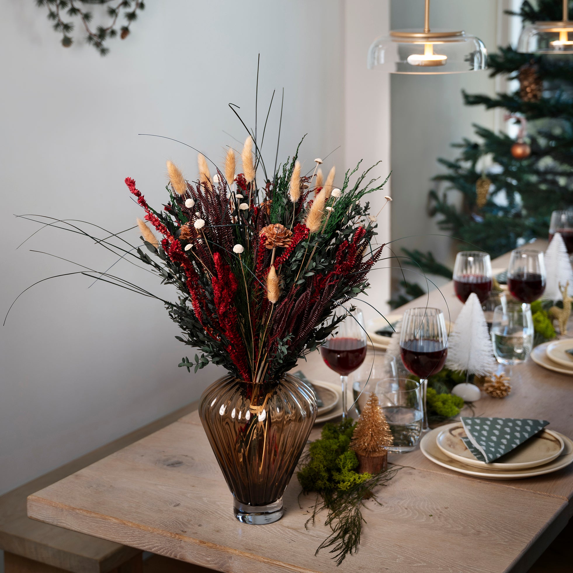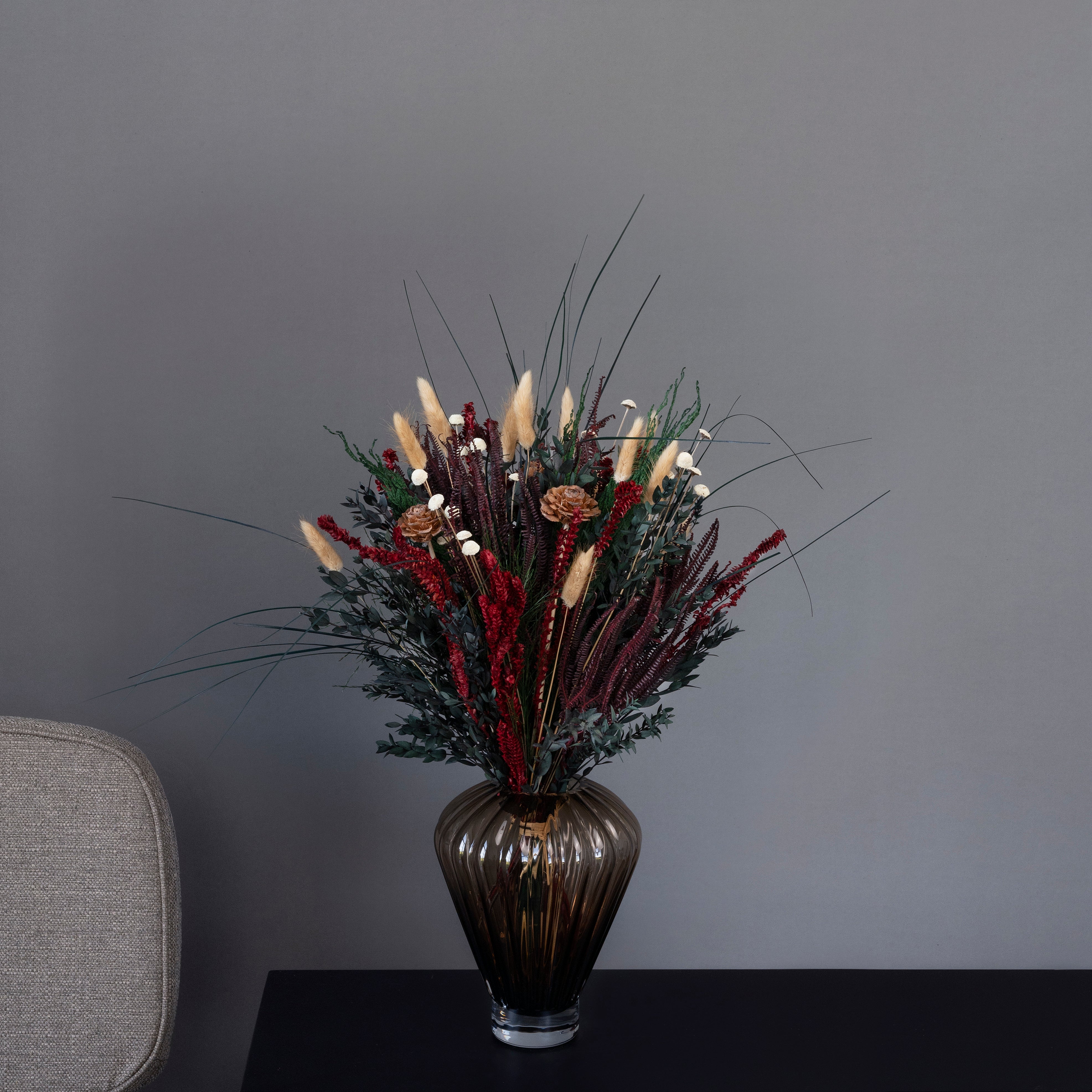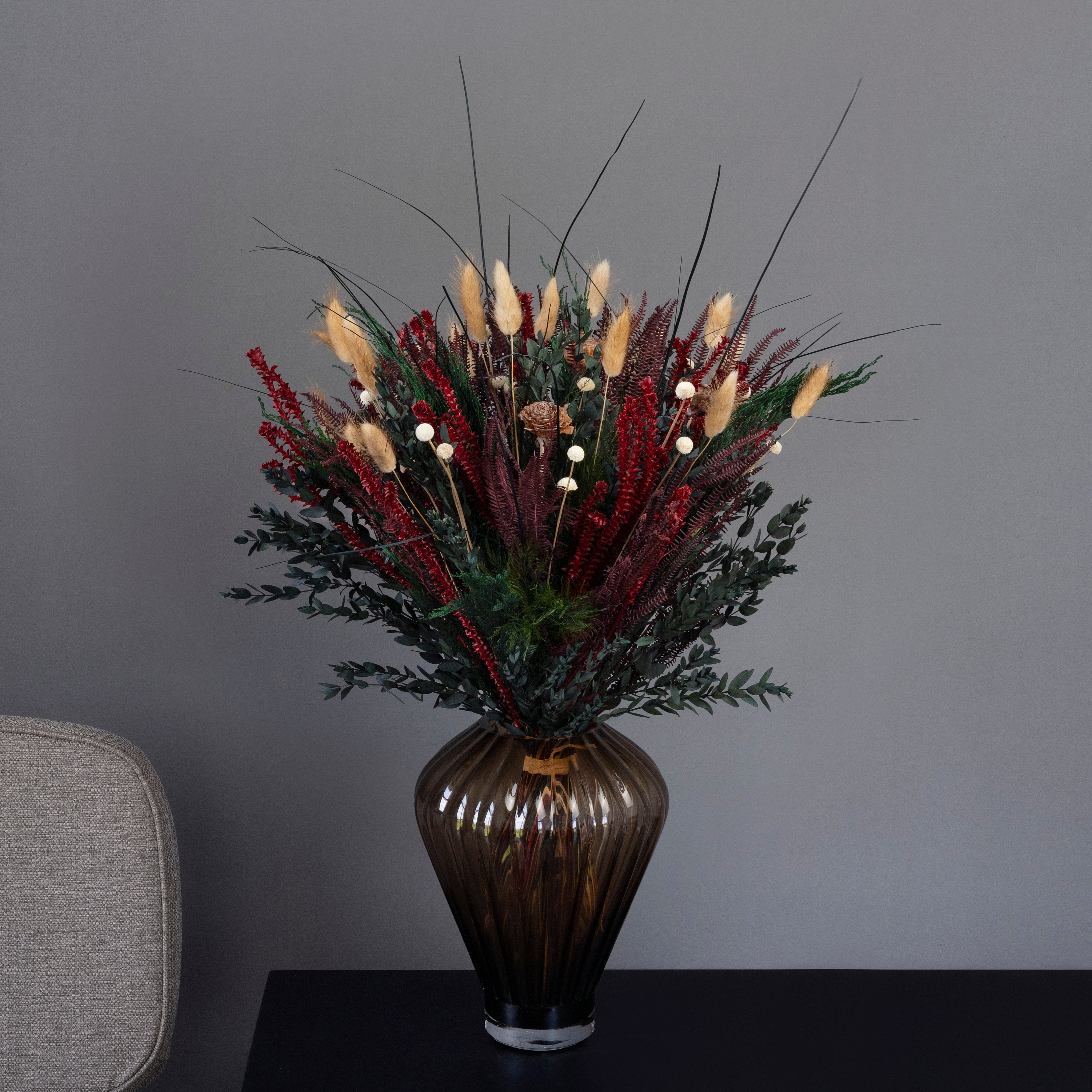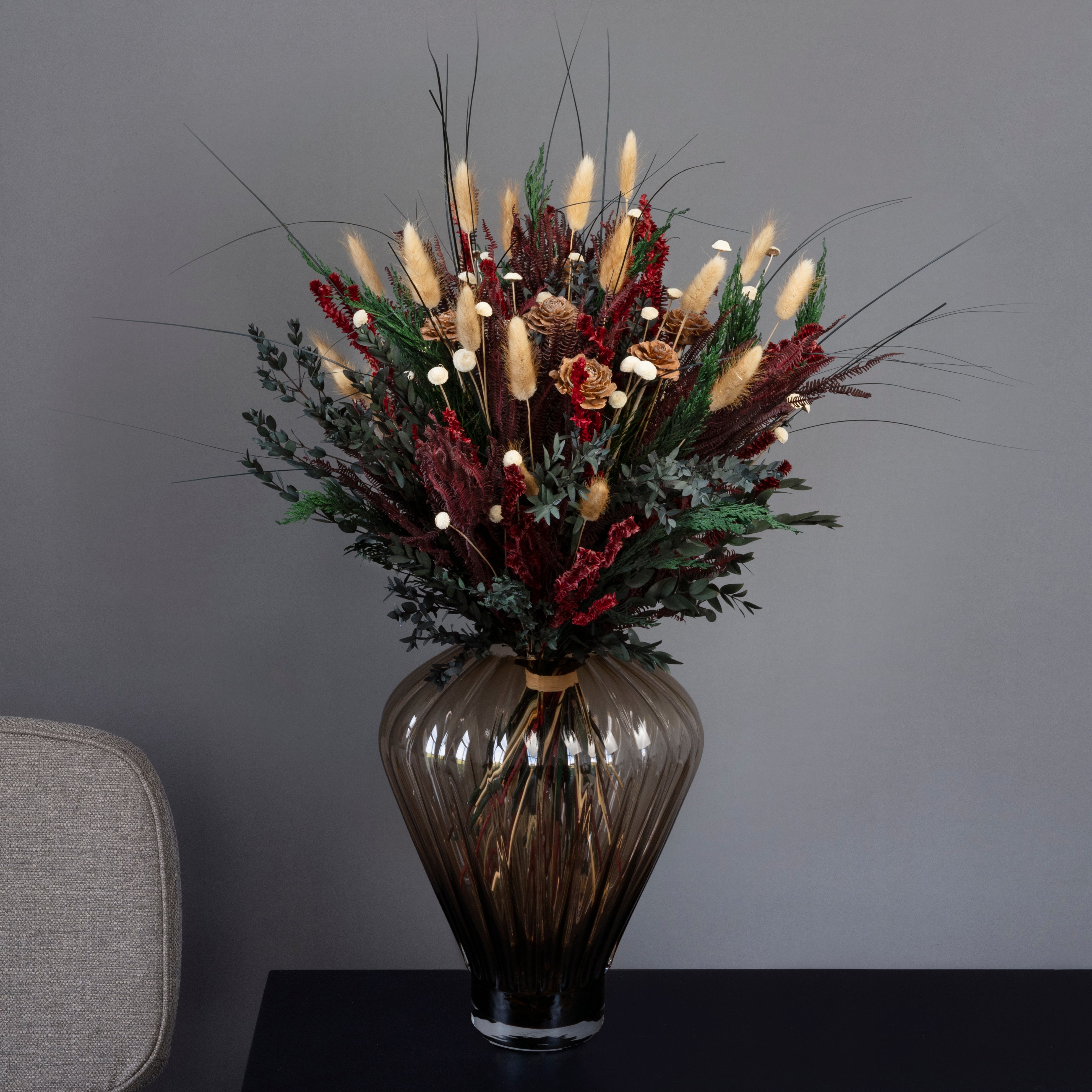 Buket Pompøs – Har en højde på 60-65 cm og er 150 % større end størrelse Naturligvis. Denne buketstørrelse passer perfekt til en stor køkken-ø eller i gulvvasen. Vi anbefaler brede og runde vaser med en højde på 30-55 cm.