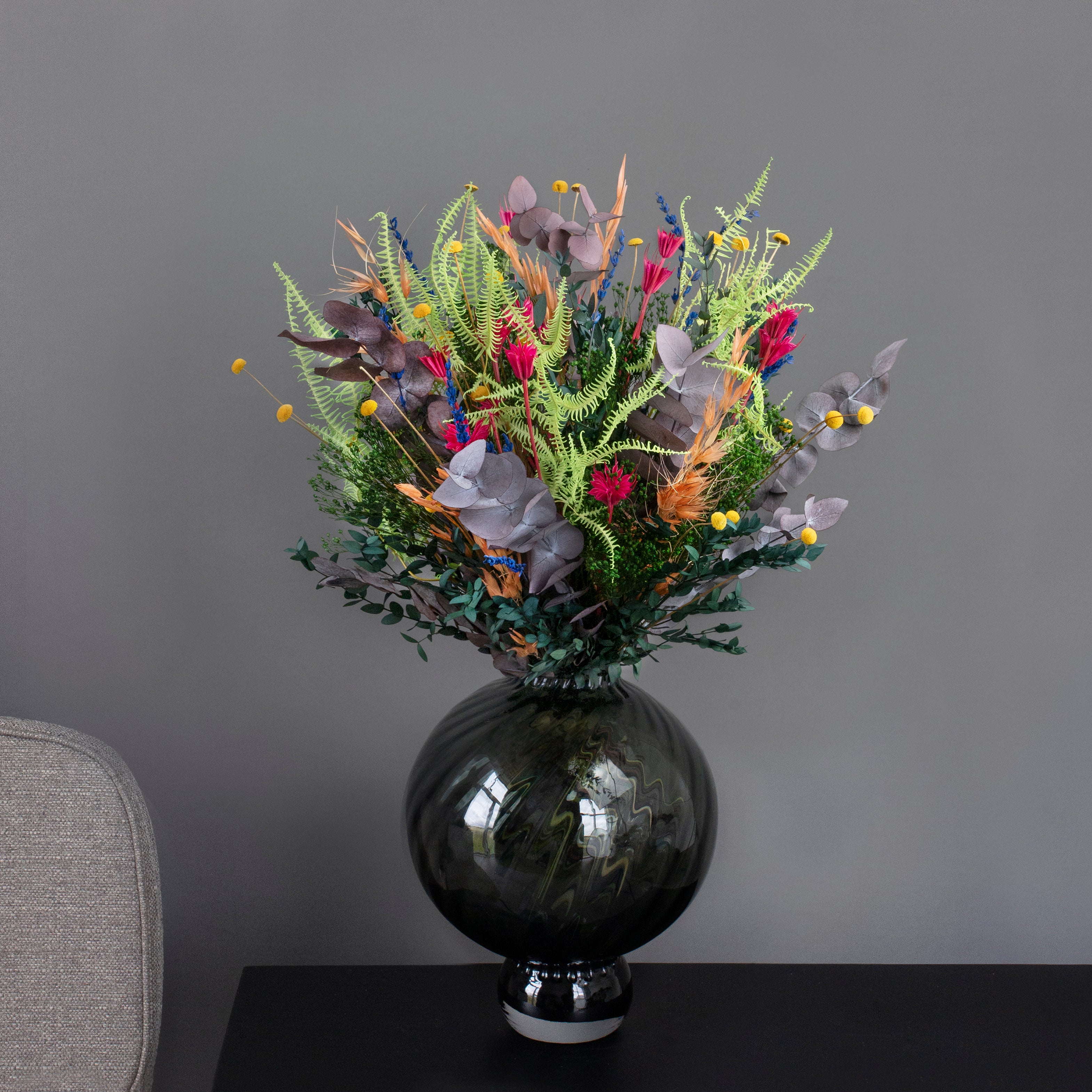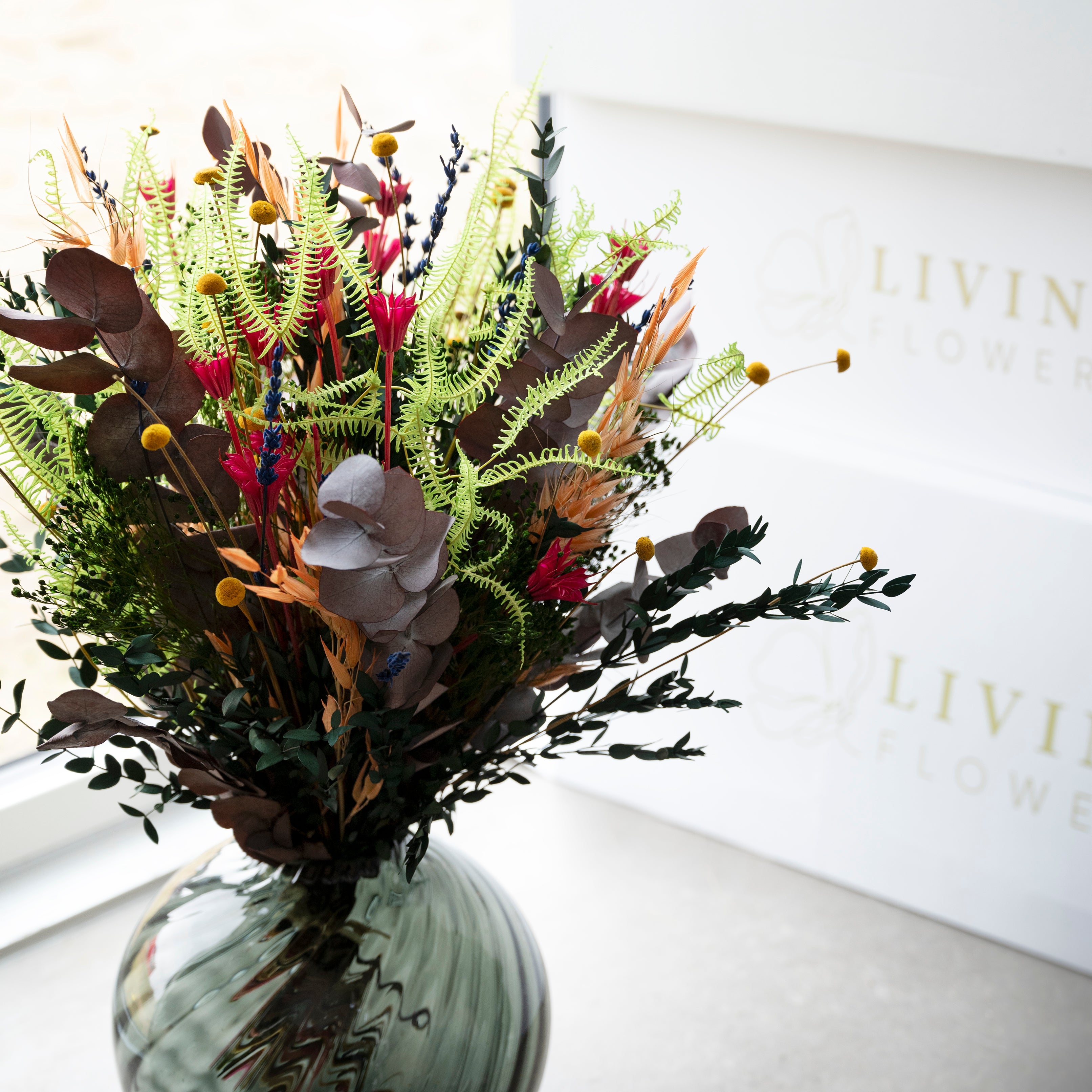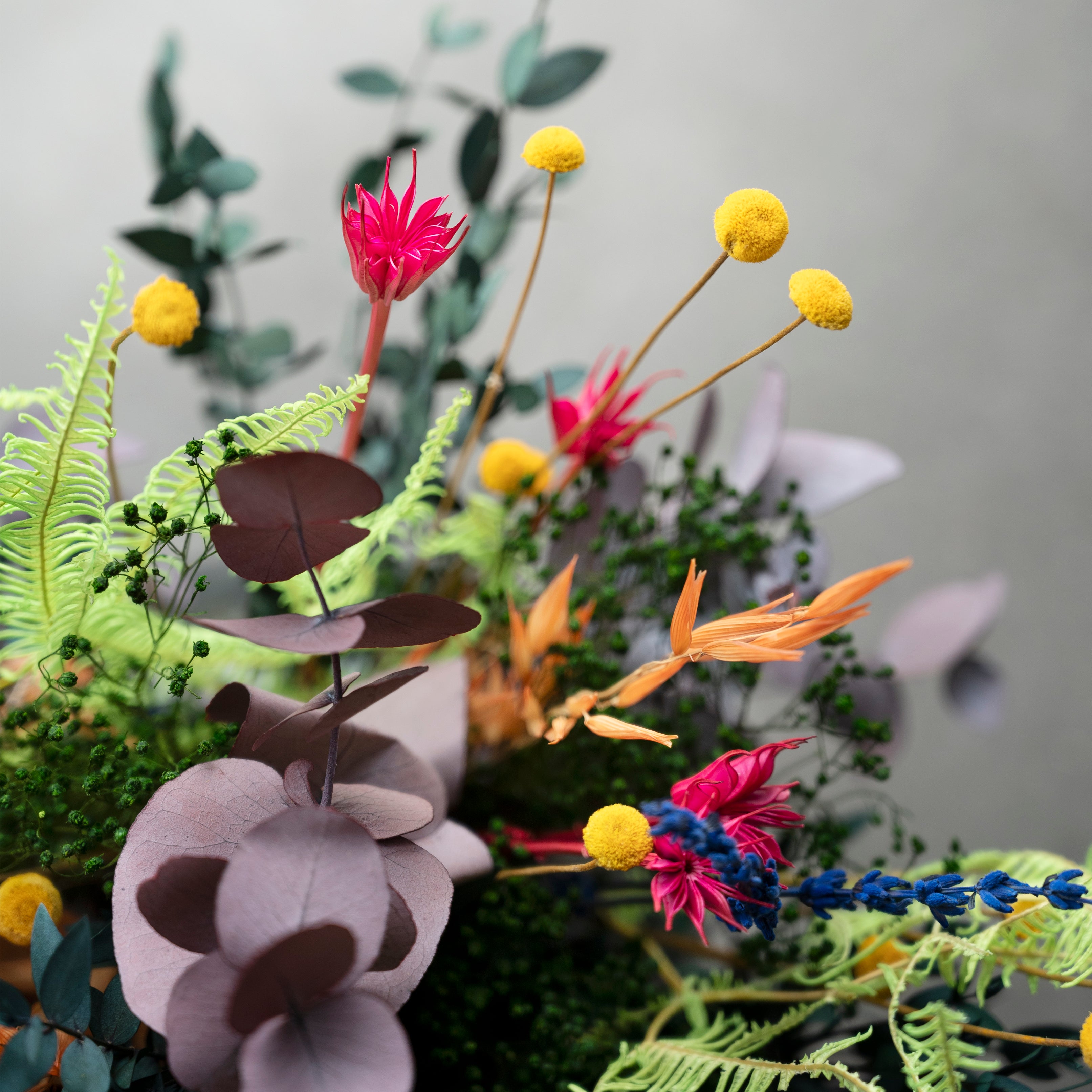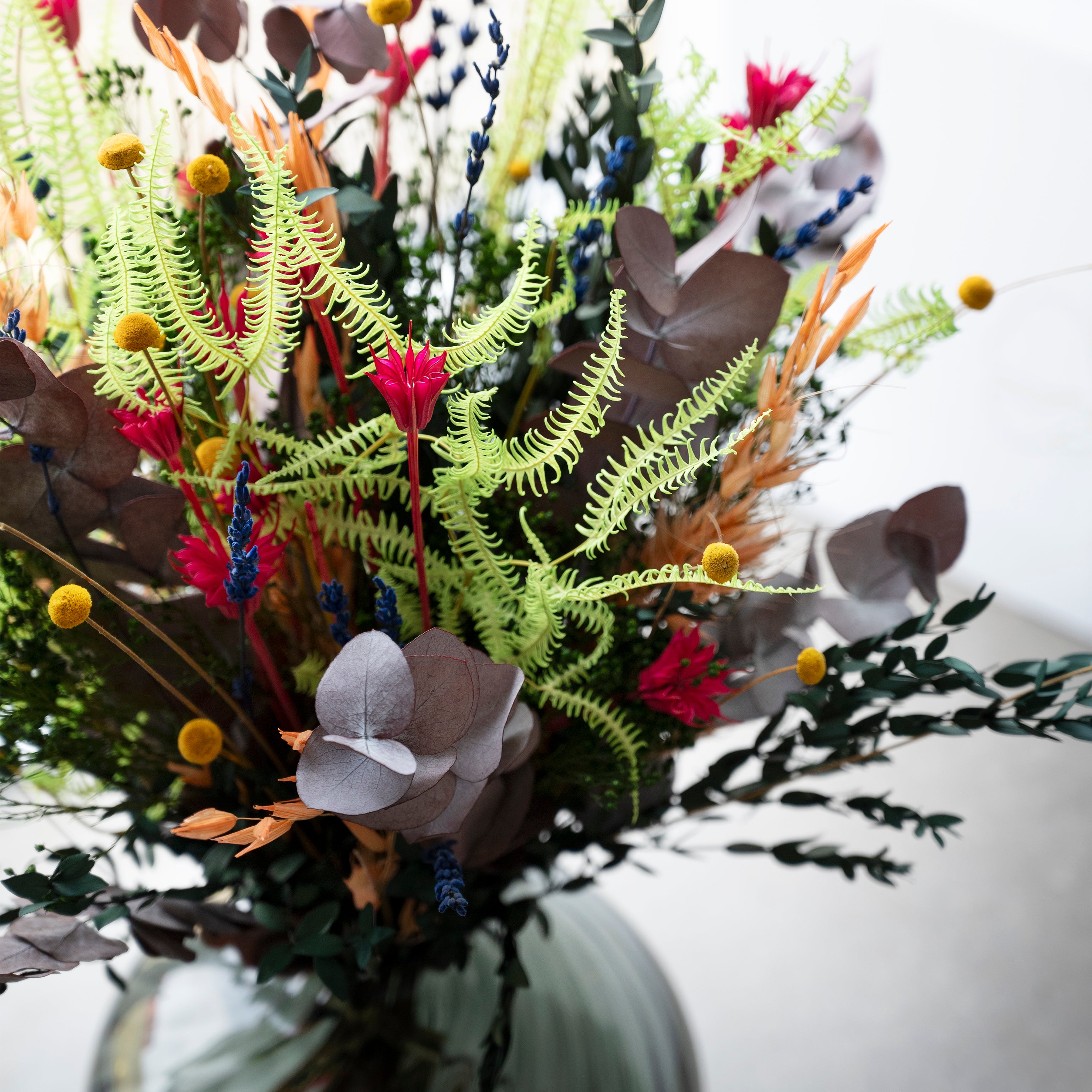 Vores buketter er hverken helt som traditionelle friske eller tørrede blomster – de befinder sig et sted midt imellem.
