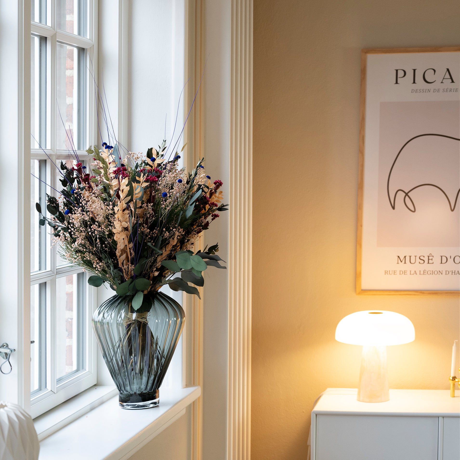 Buket Naturligvis - Har en højde på 50-55 cm og passer elegant til et lille spisebord, sofabord eller en kommode. Vi anbefaler brede og runde vaser med en højde på 15-25 cm.